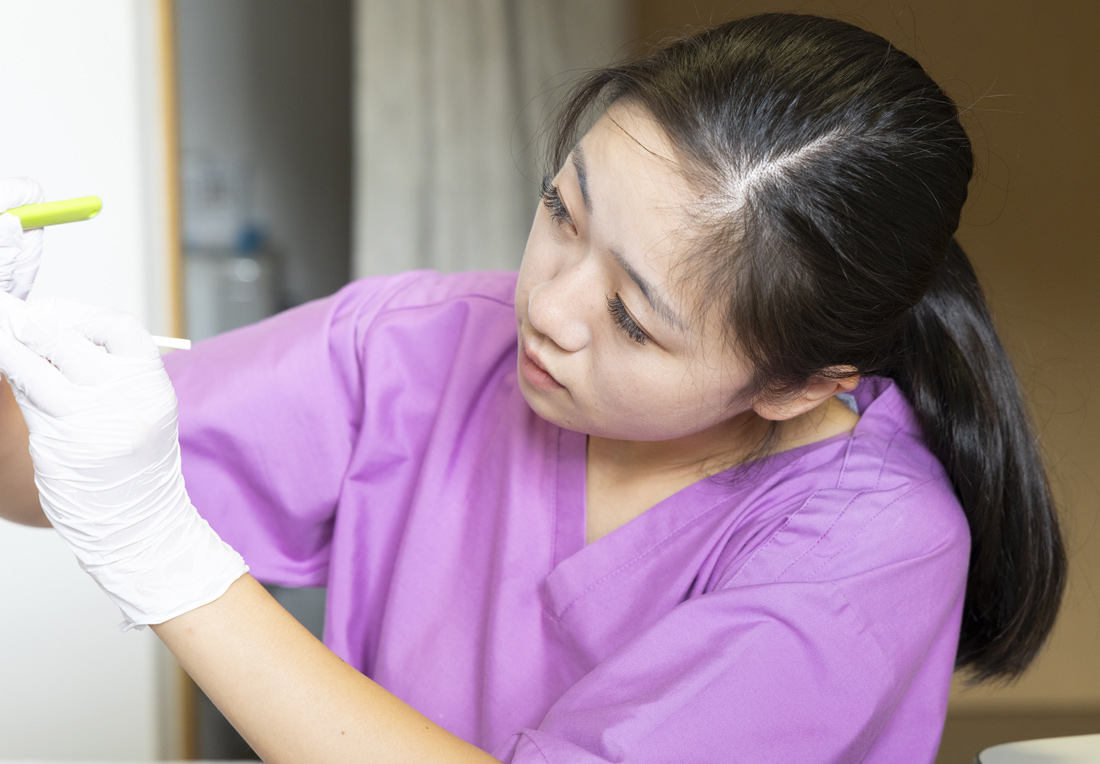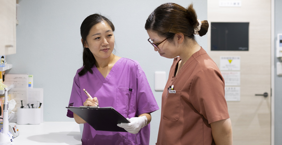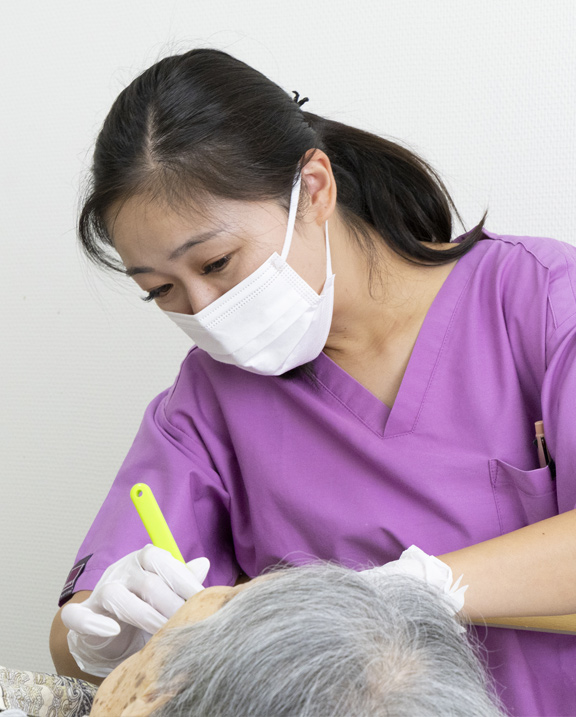 訪問診療では、ご自宅や高齢者施設などを訪問し、診療補助や口腔衛生指導を行います。また、診療における機材の準備や後片付け、嚥下内視鏡検査(VE)の補助など、歯科診療補助の範囲は多岐にわたり、歯科診療を円滑に行うために大切な役割を果たしています。最近では、摂食・嚥下機能訓練(直接訓練・間接訓練)など、専門性を活かした業務にも従事しており、歯科医師のみならず、医師・看護師・リハビリスタッフ・施設職員の方々など、多職種の方々とのコミュニケ-ションを図るやりがいのあるお仕事です。
